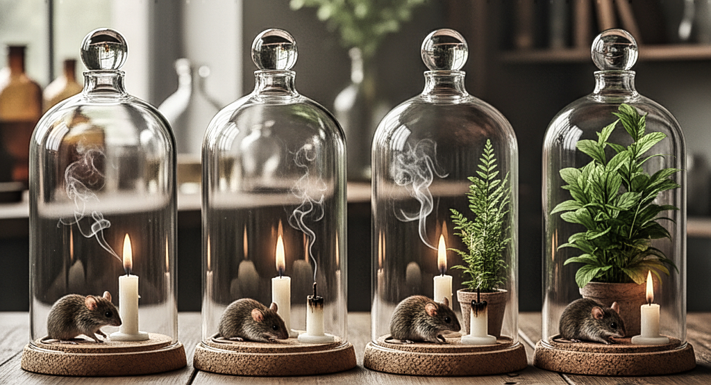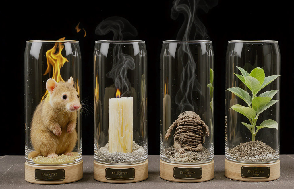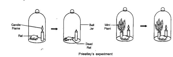 Erstelle das Experiment nach Priestley mit 4 Glasglocken. In der ersten ist eine Maus mit einer brennenden Kerze. In der zweiten ist eine tote Maus mit der gerade erloschenen Kerze. In der dritten und vierten ist zusätzlich eine Pflanze.
